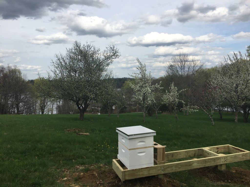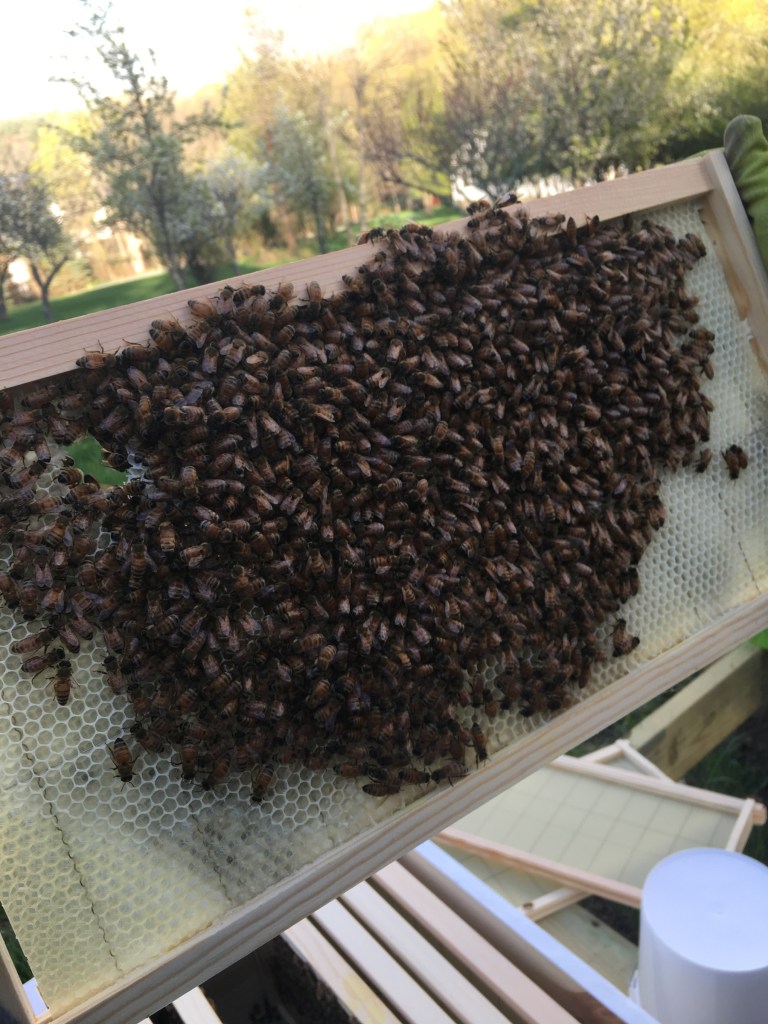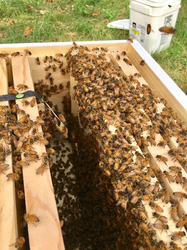We closed up the hive, adding the feeder bucket to supplement their foraging for pollen and nectar. We want a strong hive and feeding them in the beginning will give them a head start making honeycomb. We walked away, leaving the hive to settle into their routine.